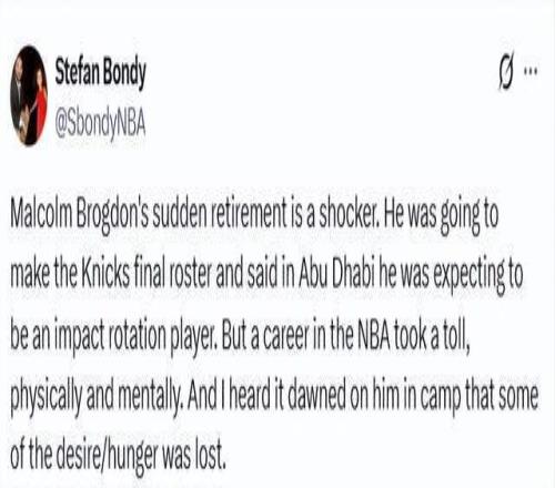 尼克斯队记Bondy表示:“NBA生涯的消耗实在太大,无论是身体还是精神层面,我听说布罗格登在训练营中突然意识到自己失去部分渴望与斗志。”