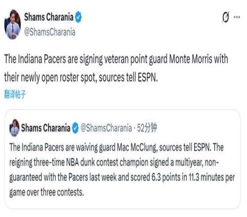 北京时间11月7日,据名记Shams报道,步行者队将裁掉麦克朗,并签下蒙特-莫里斯。步行者队记Dopirak透露,莫里斯将签下一份为期一年的非保障合同。