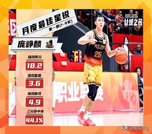 北京时间1月4日,根据CBA官方的公示,江苏新秀球员庞峥麟成为25-26赛季,首期的月度最佳星锐球员。