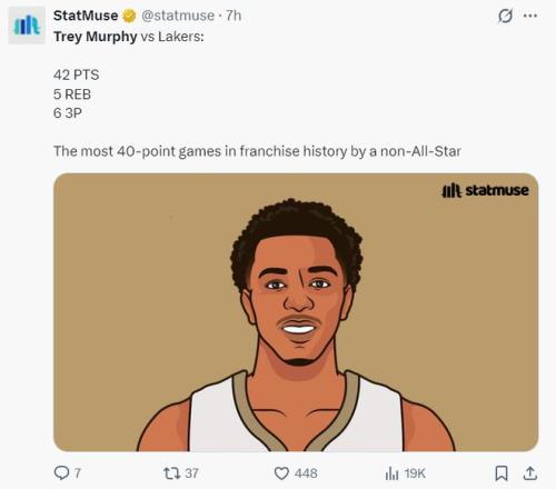 本赛季的墨菲各项数据都有极大提升,场均35.6分钟,拿到21.3分6.1篮板3.5助攻1.5抢断0.2盖帽,命中率49.5%,三分命中率38.2%,鹈鹕官方一直在为他拉全明星选票。